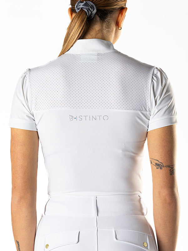 La polo da concorso a manica corta Heartbeat si caratterizza per la presenza dello scollo a cuore con materiale traforato. Il materiale è tecnico ad asciugatura rapida. Ha loghi con cristalli, primo bottone gioiello e manica corta arricciata.
