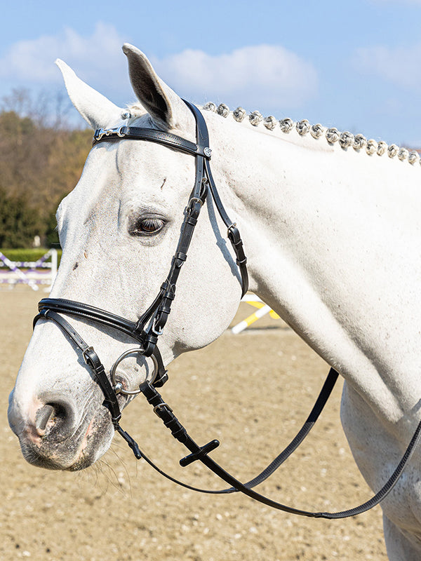 Testiera realizzata in cuoio di buona qualità con morsetto nichelato, completa di redini ricoperte in gomma e fibbie in acciaio inox.