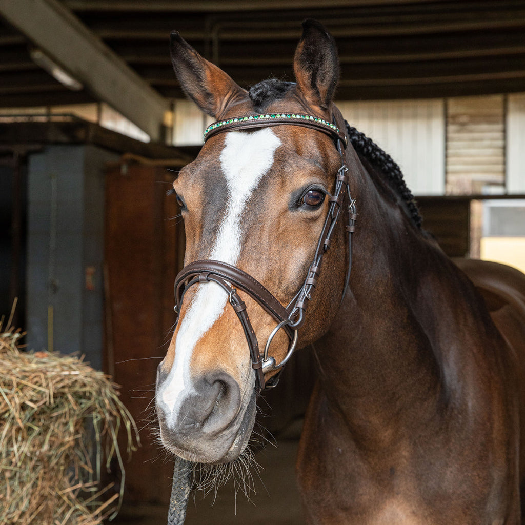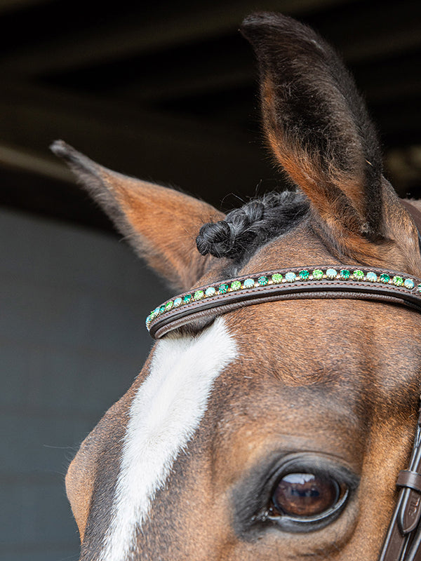 Testiera crystal verde con redini incluse antiscivolo. Con frontalino con cristalli verde.
