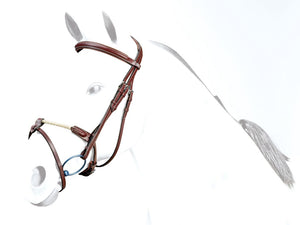 Testiera in cuoio con sopraccapo anatomico antistress. Con capezzino irlandese in cuoio "Raw", frontalino bombato.